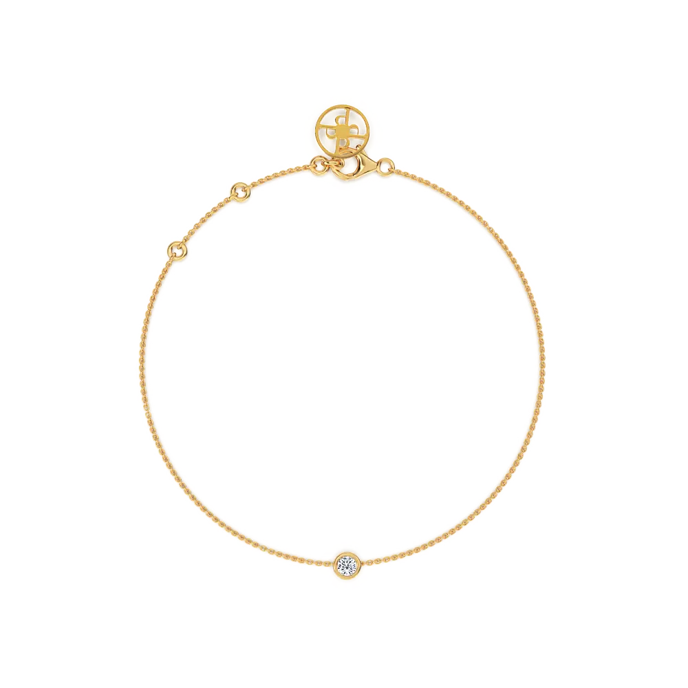 This delicate chain in 18 karat gold features a bezel set round brilliant cut diamond. The diamond bracelet can easily be styled with other bracelets or worn by it’s own.
