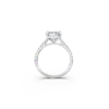 This exquisite emerald cut diamond ring showcases a sleek, flatter shank adorned with a castle-set diamond band that extends three-quarters of the way down the shank. The design features a stunning cathedral setting, elegantly elevating the center diamond, which is secured by four expertly crafted claws. This combination of details creates a timeless piece that beautifully highlights the brilliance of your chosen diamond.