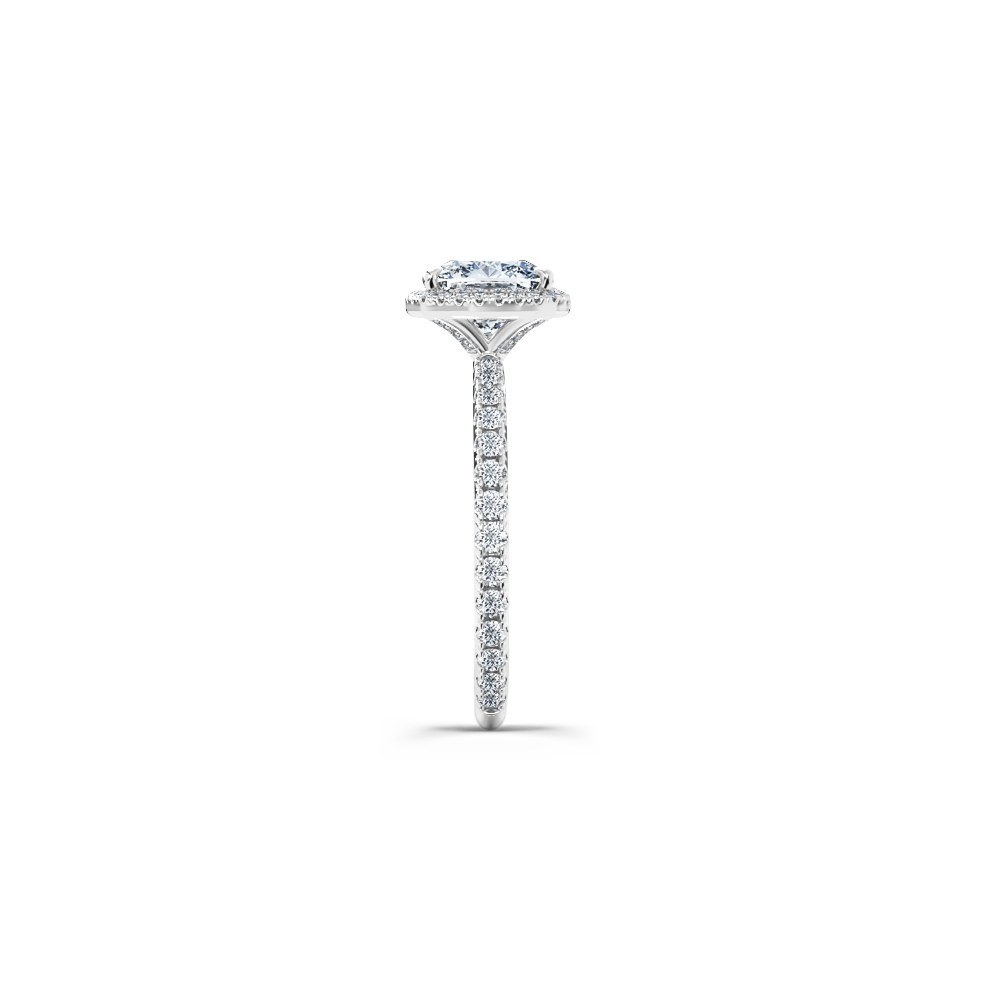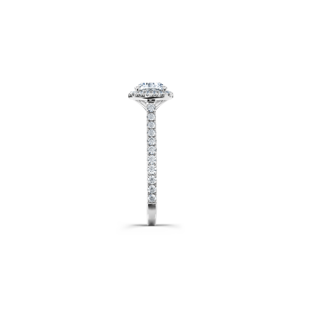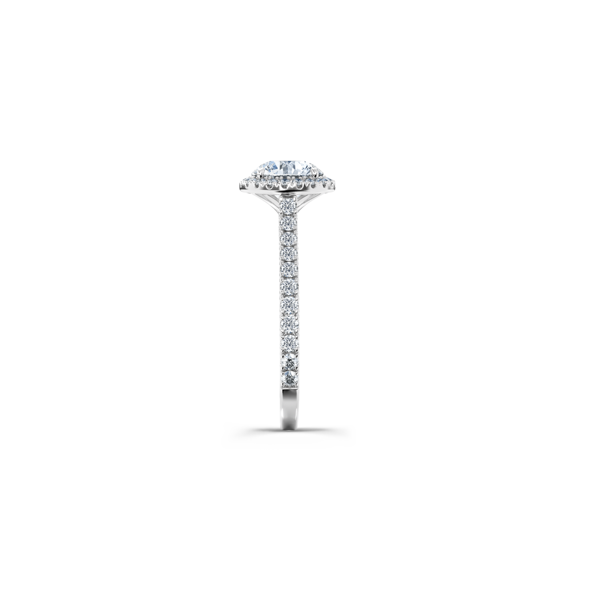 En vacker haloring designad och tillverkad av A.P. Shaps. Förlovningsringen har en rund briljantslipad diamant omfamnad av mindre briljantslipade diamanter som skapar en vacker haloring. Förlovningsringen har även castell-infattade diamanter runt ringskenan. En ring för personen som vill ha en mer modern design med romantiskt formspråk.