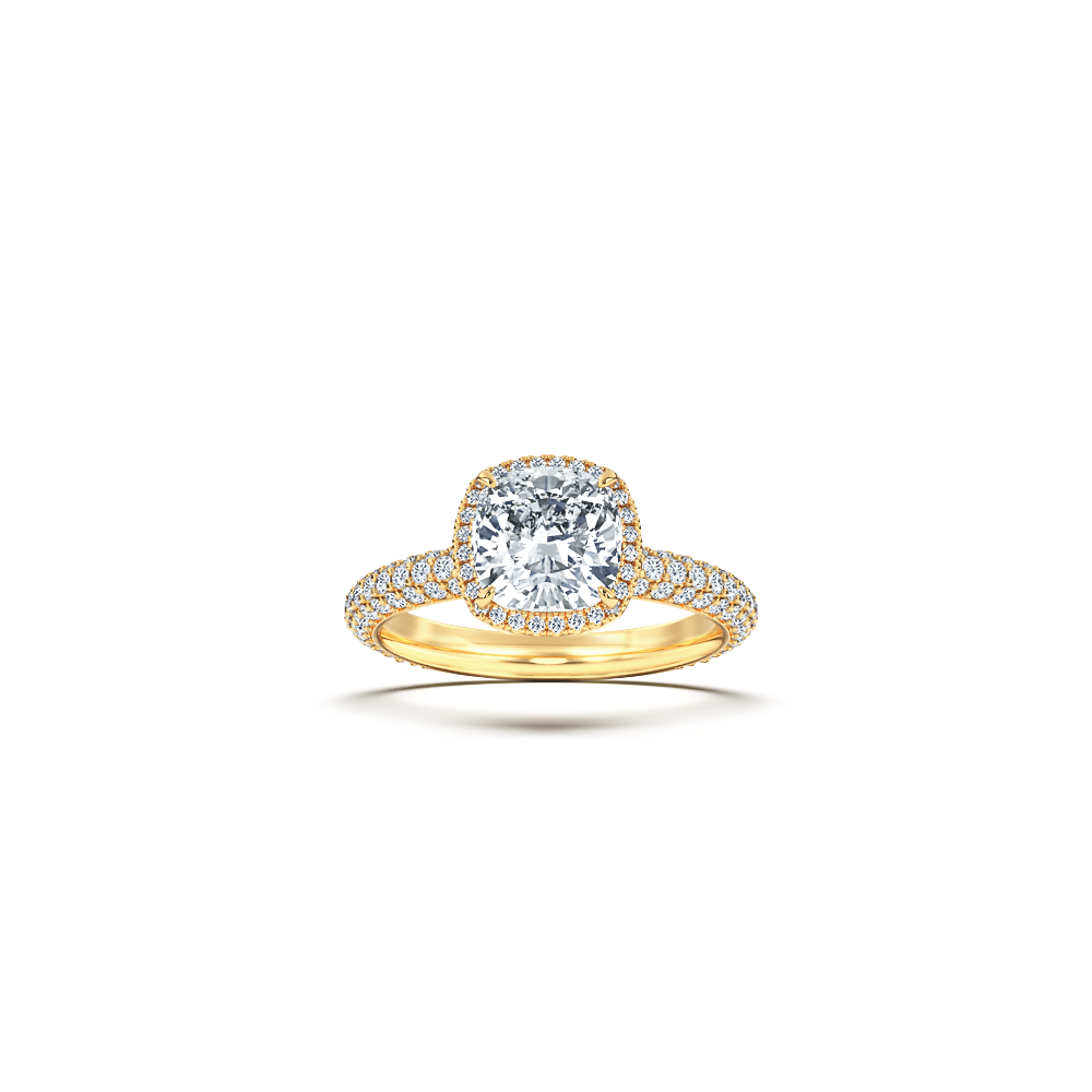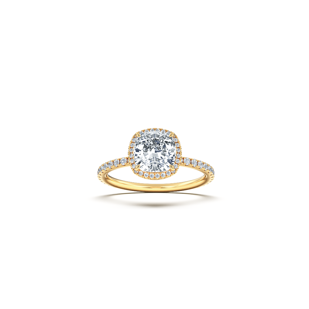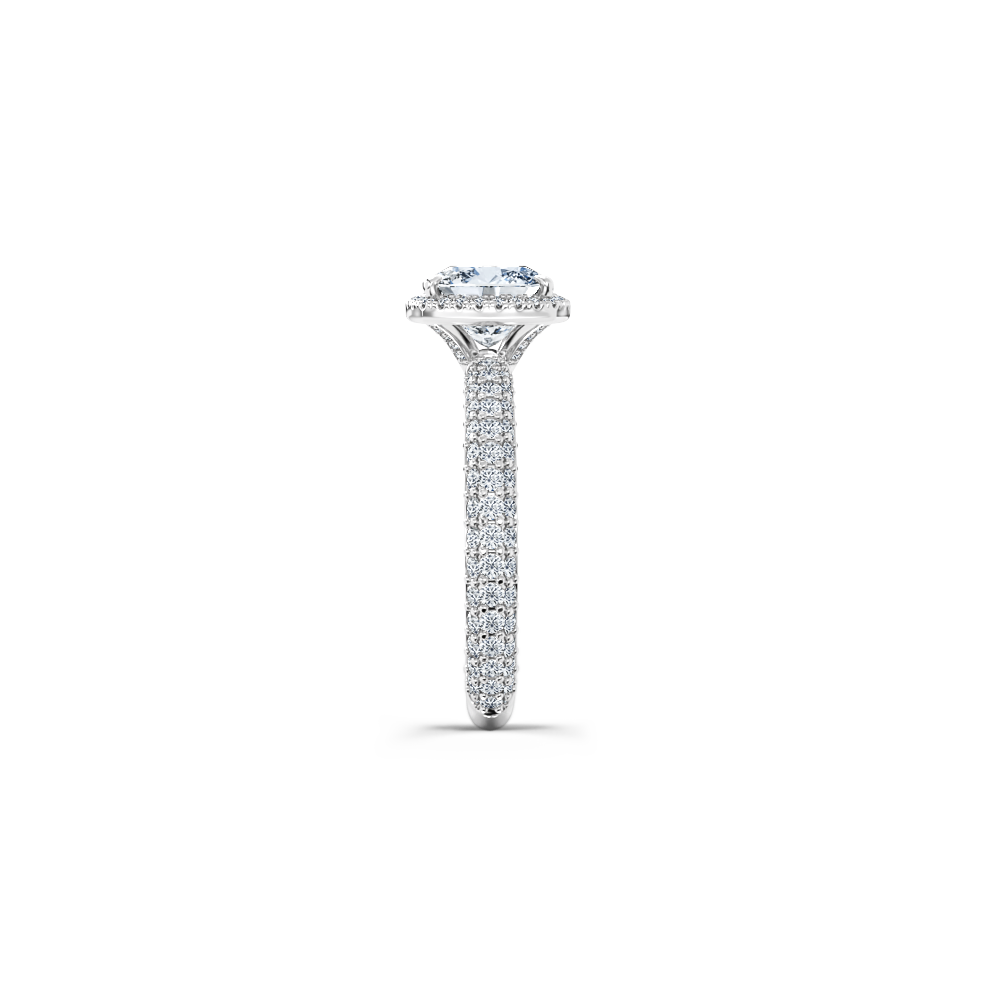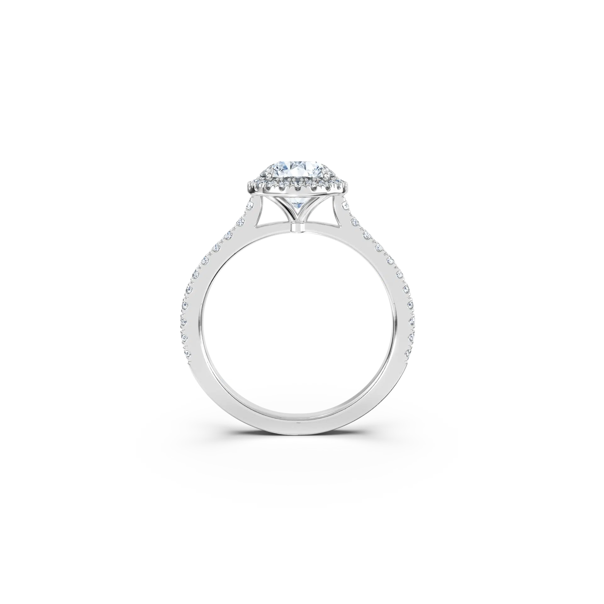 En vacker haloring designad och tillverkad av A.P. Shaps. Förlovningsringen har en rund briljantslipad diamant omfamnad av mindre briljantslipade diamanter som skapar en vacker haloring. Förlovningsringen har även castell-infattade diamanter runt ringskenan. En ring för personen som vill ha en mer modern design med romantiskt formspråk.