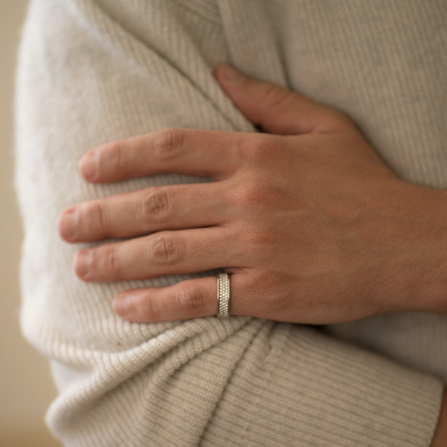 D-lace är en vacker diamantring med ett hårdare och mer maskulint uttryck. Ringen har 221 stycken pavé-infattade diamanter längst hela ringskenan och kan göras i tre guldfärger. Total caratvikt är 1.76 carat.