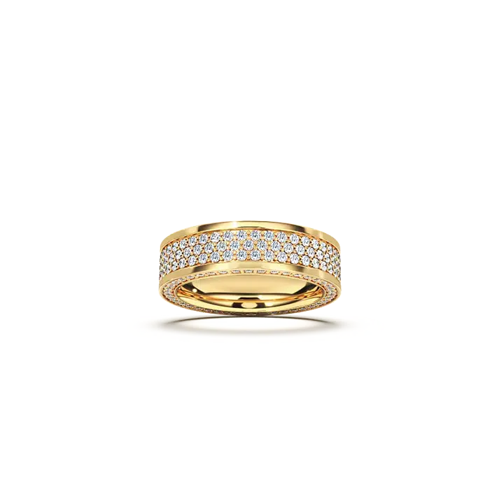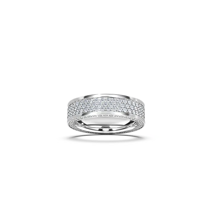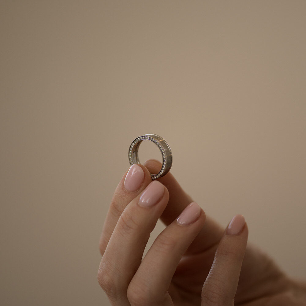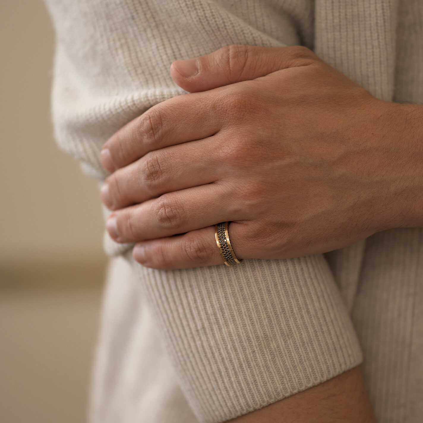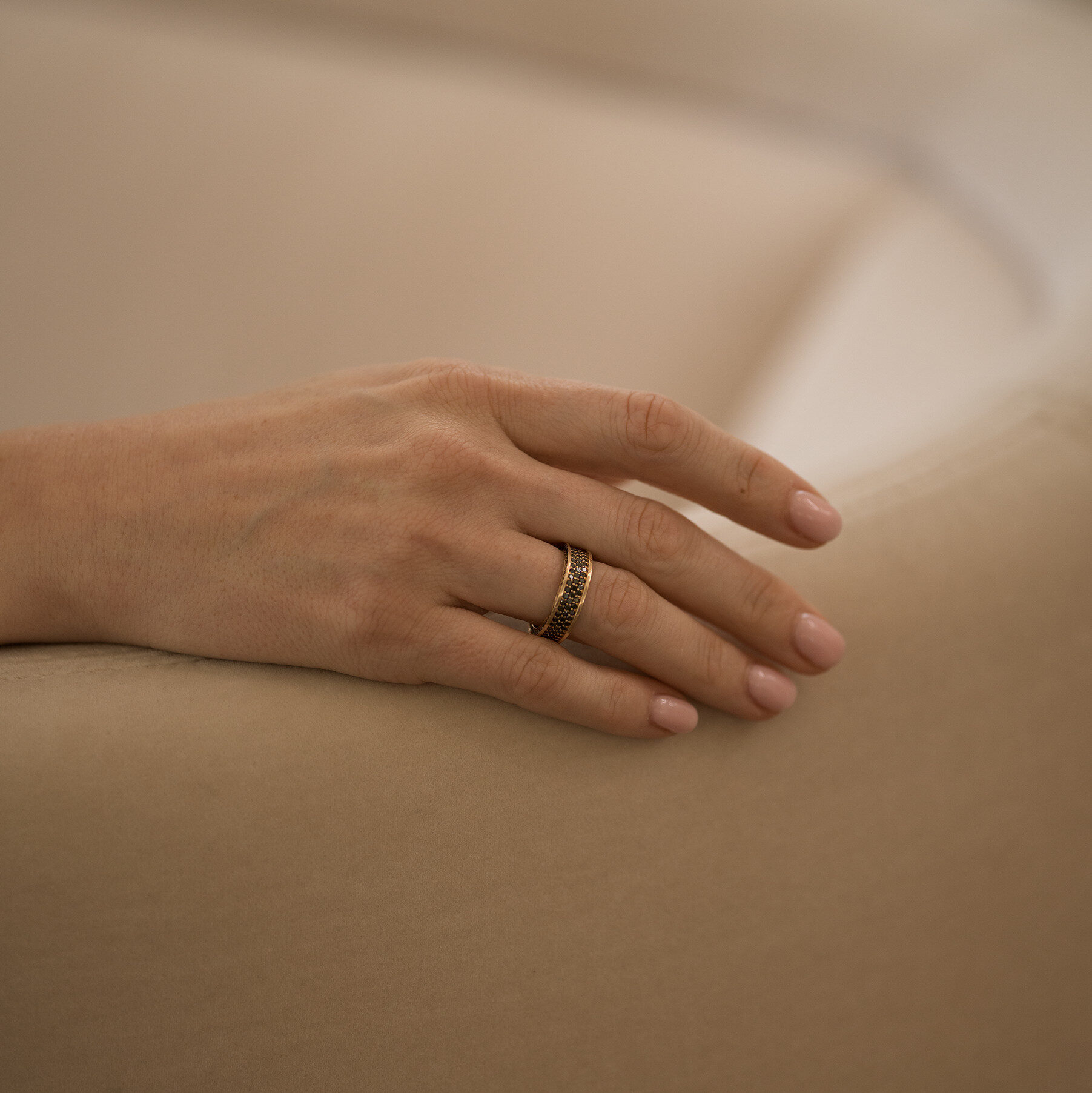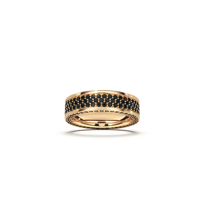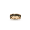 D-lace är en vacker diamantring med ett hårdare och kantigare uttryck. Ringen har pavé-infattade svarta diamanter längst hela ringskenan och kan göras i tre guldfärger.
